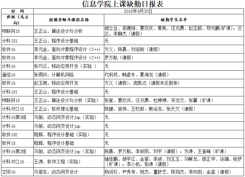 9月30日上课缺勤情况通报
