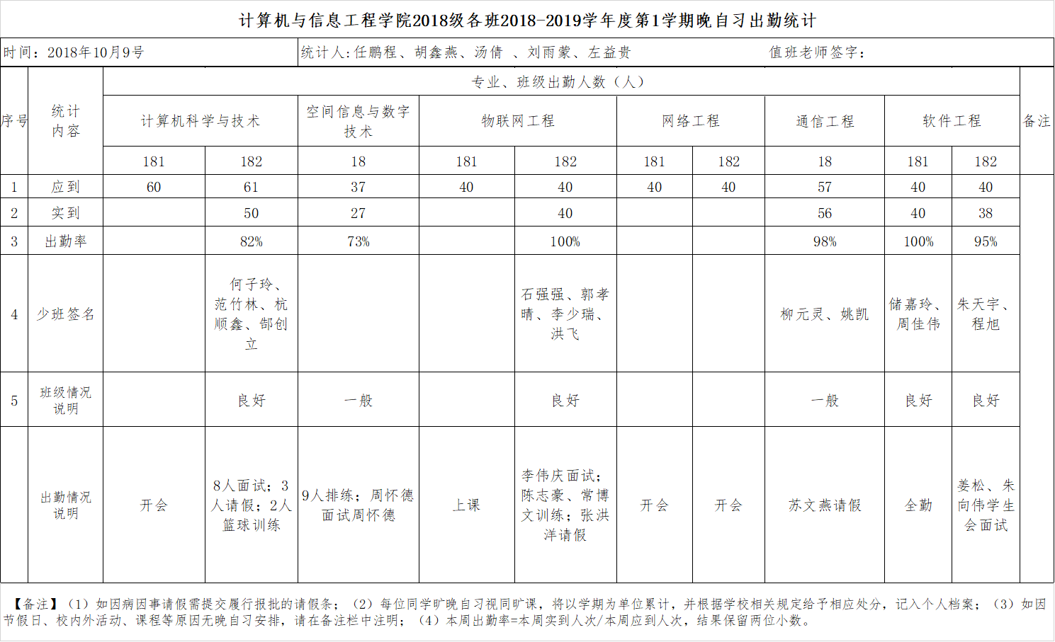 10月9日大一晚自习出勤情况通报