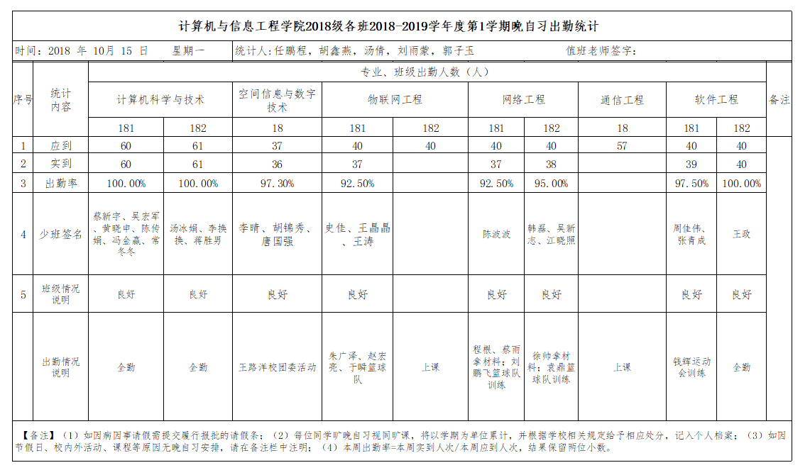10月15日大一晚自习出勤情况通报