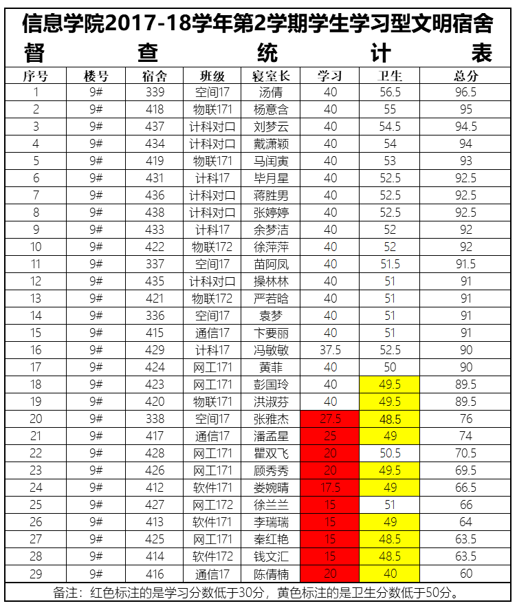 9周1次学习型文明宿舍检查情况通报