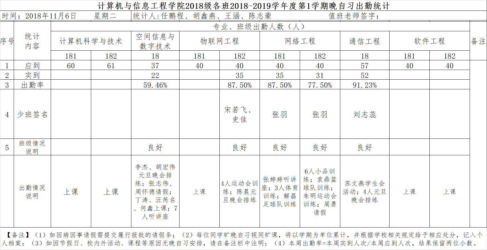 11月6日大一晚自习出勤情况通报