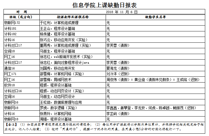 11月6日上课缺勤情况通报