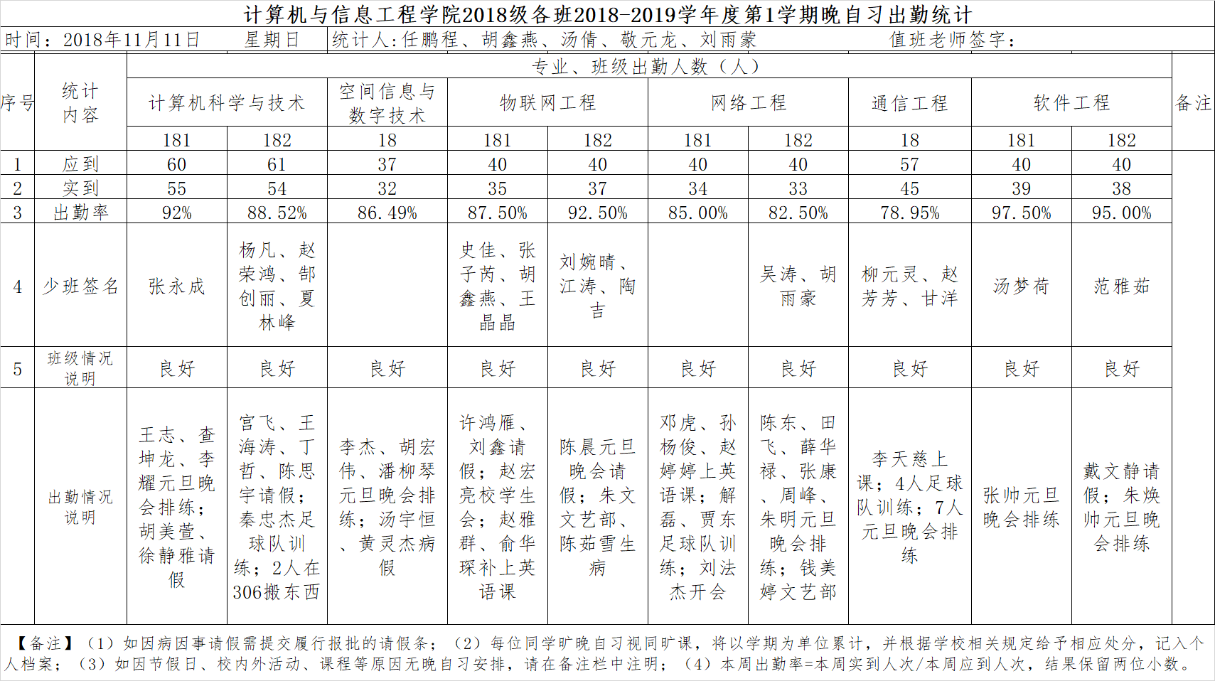 11月11日大一晚自习出勤情况通报