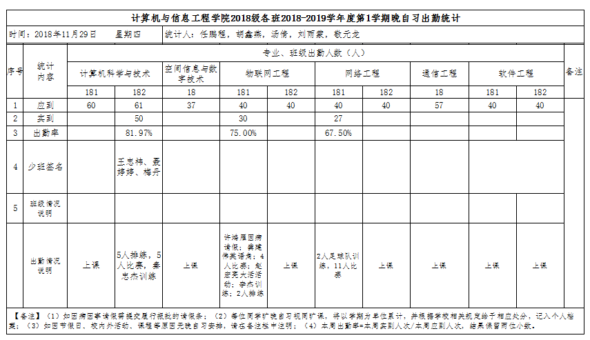 11月29日大一晚自习出勤情况通报