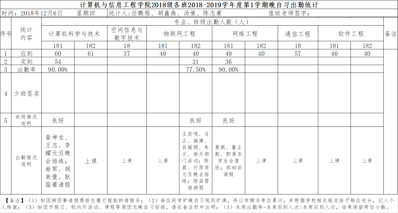 12月6日大一晚自习出勤情况