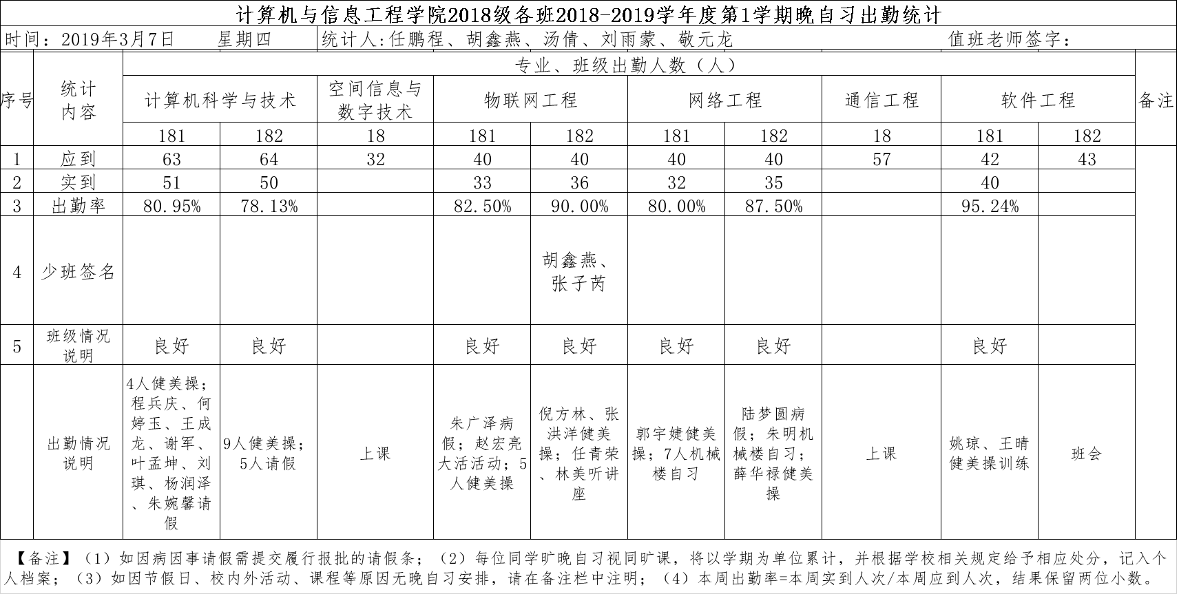 3月7日大一晚自习出勤情况