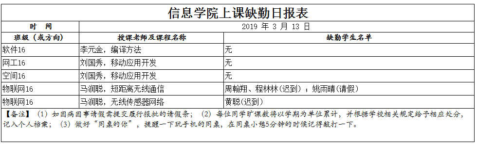 3月13日上课缺勤情况通报