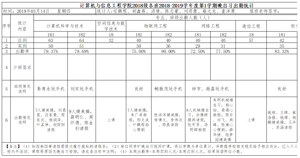 3月14日大一晚自习出勤情况