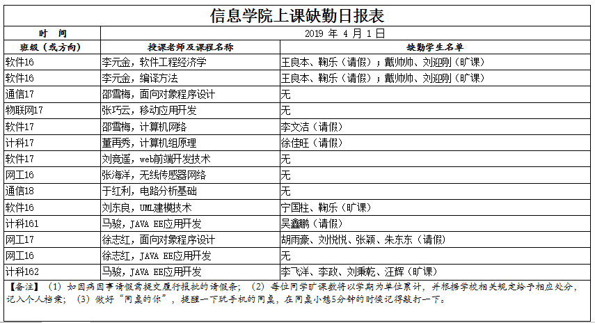 4月1日上课缺勤情况通报