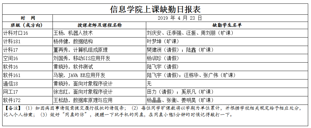 4月23日上课缺勤情况通报