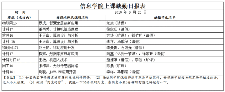 5月20日上课缺勤情况通报