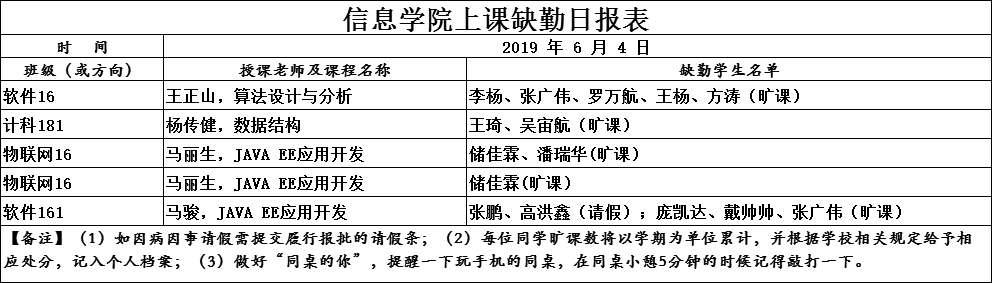 6月4日上课缺勤情况通报