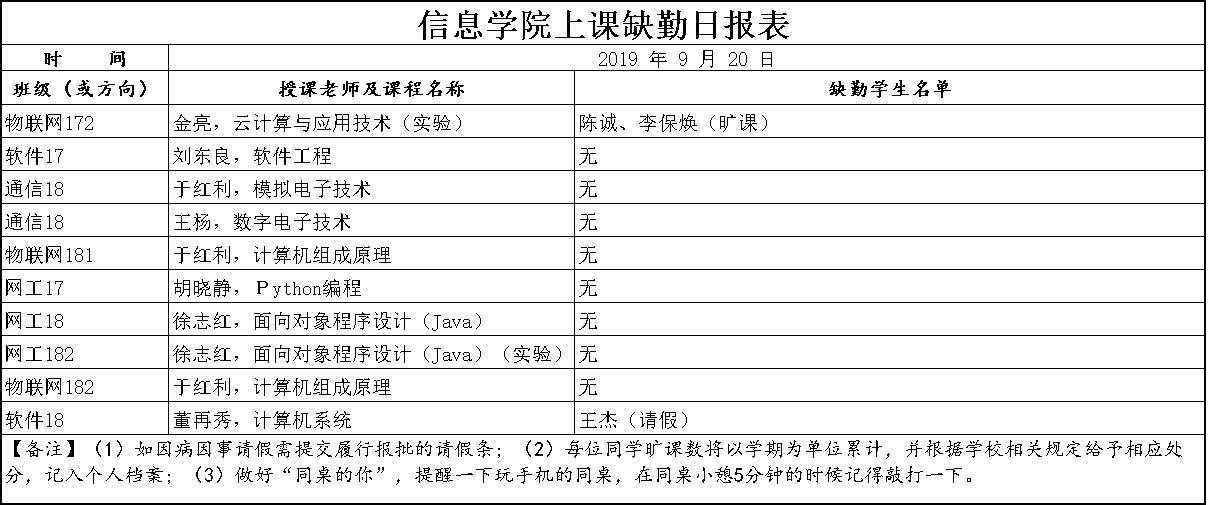9月20日上课缺勤情况通报