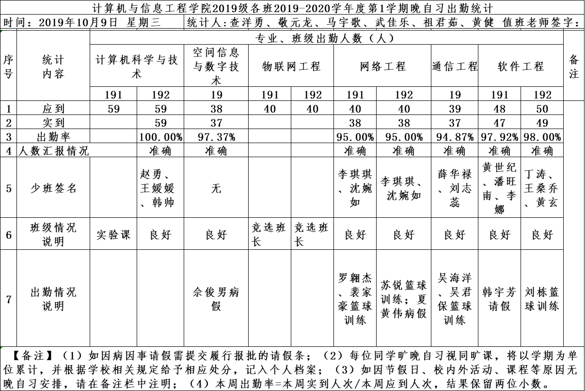 10月9日大一晚自习出勤情况