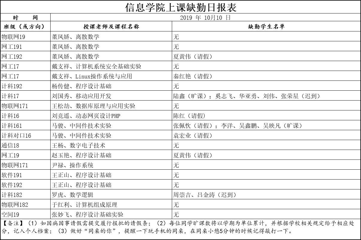 10月10日上课缺勤情况通报