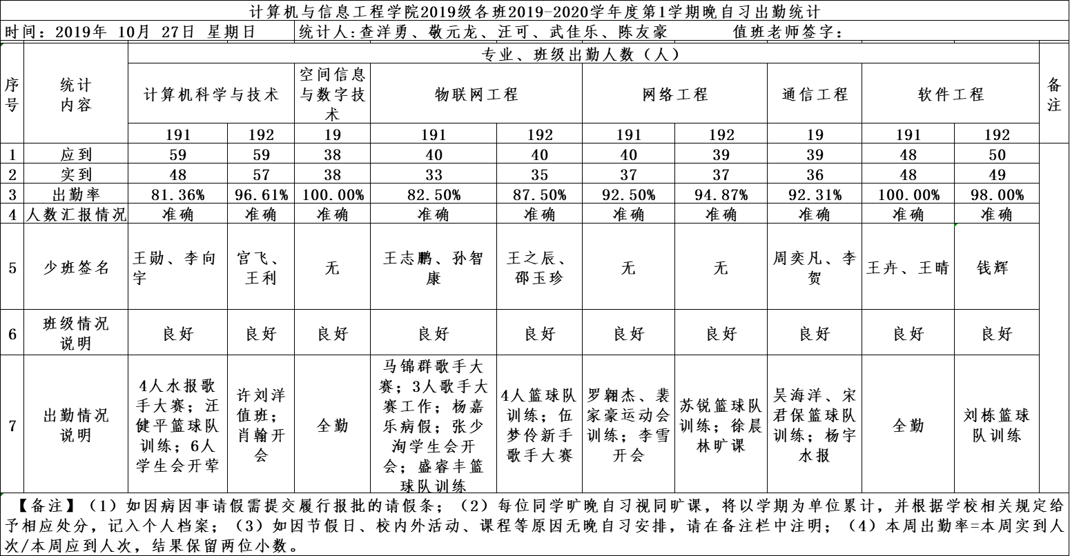 10月27日大一晚自习出勤情况