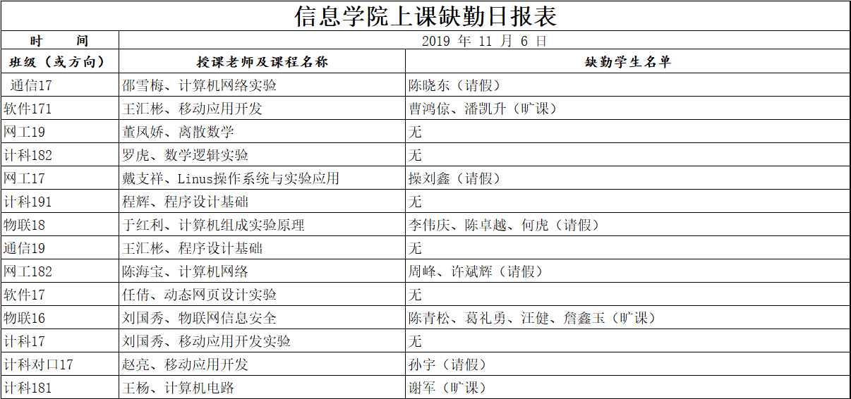 11月6日上课缺勤情况通报