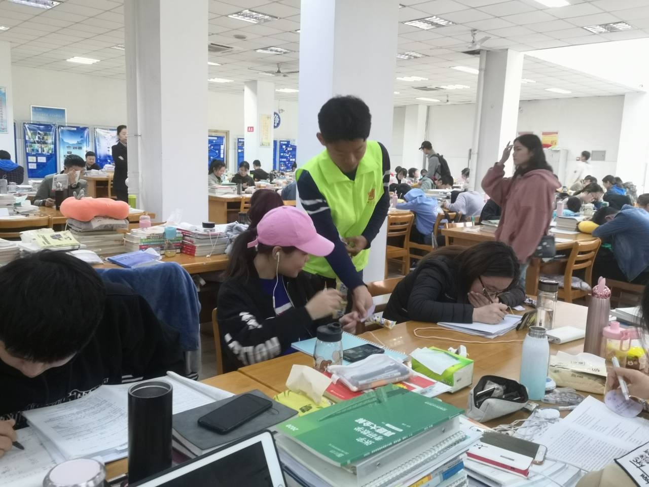 活动开始前,志愿者们在山下食堂门口集合,负责人进行点名签到,并对志愿者们的任务进行了合理的分配。任务分配后,负责人带领志愿者到达指定地点开始了本次的志愿活动。活动过程中,志愿者拿着事先准备好的小礼物经过自习室管理员的同意后来到自习室,看着认真学习的备考学子们,志愿者们不忍打扰,静静地把准备好的糖果和便利贴放到备考的学子的桌旁,志愿者们准备的每张便利贴上都有暖心的祝考话语,一方面是想鼓励备考学子,另一方面也是想告诉他们,他们并不是在孤军奋战。在他们的休息时间,志愿者们与他们进行了简短的轻声交谈,同时也送上了自己对他们的祝福。活动结束后,志愿者们在图书馆门前合影留念后离开。