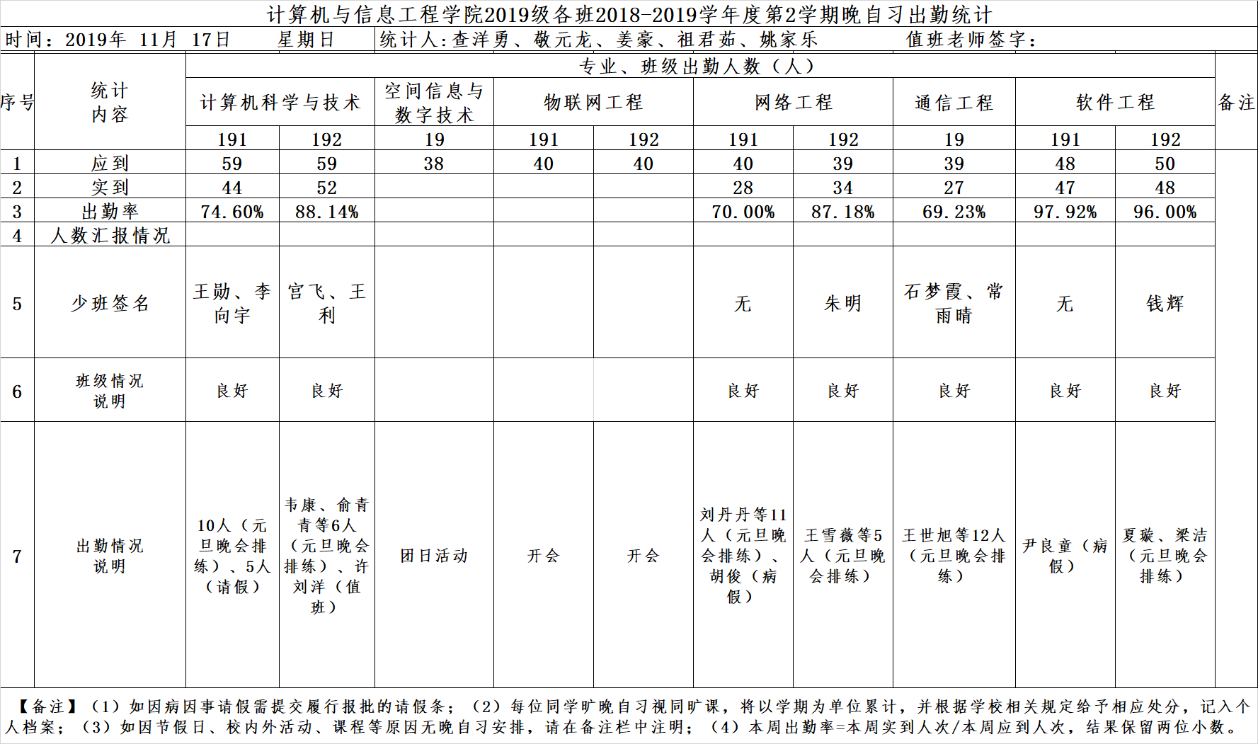 11月17日大一晚自习出勤情况