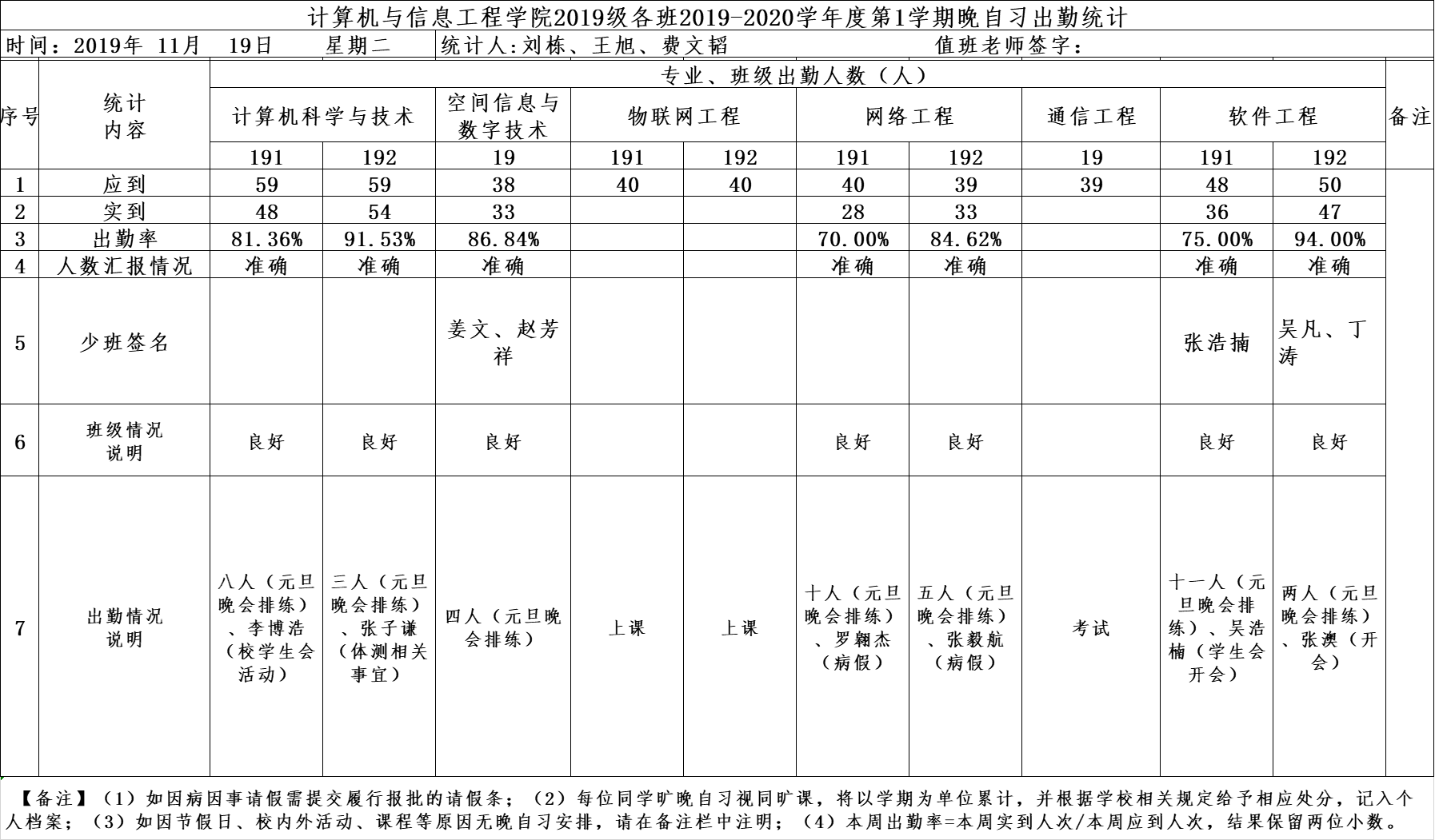 11月19日大一晚自习出勤情况