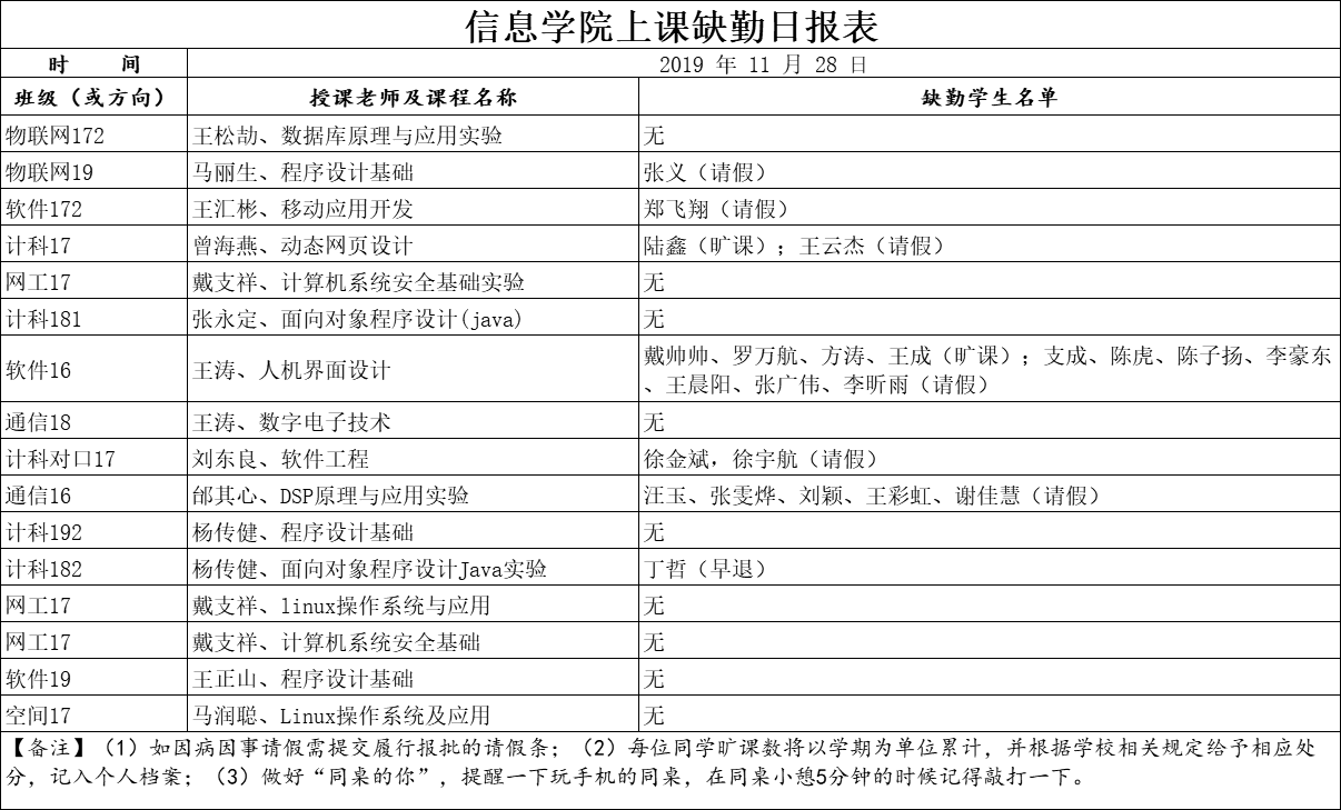 11月28日上课缺勤情况通报