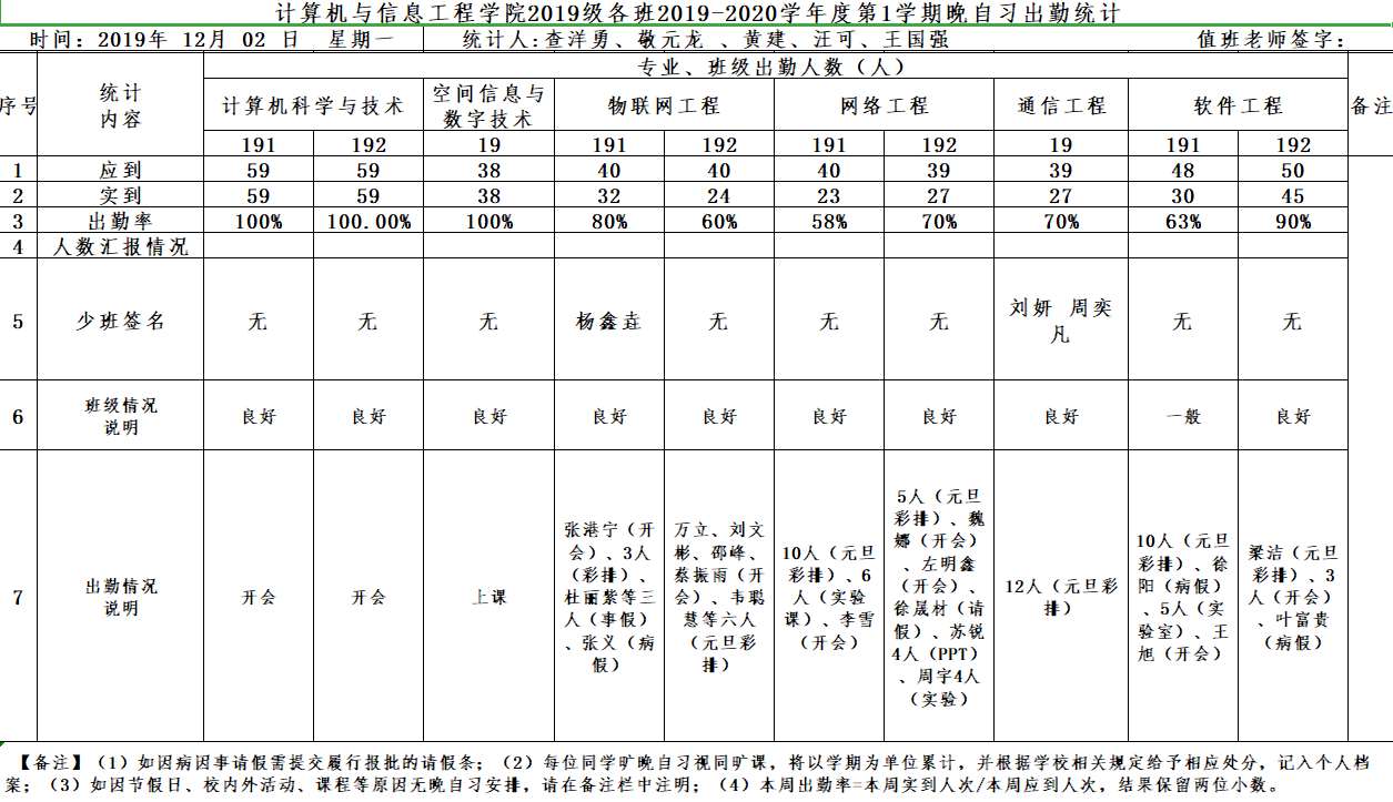 12月2日大一晚自习出勤情况