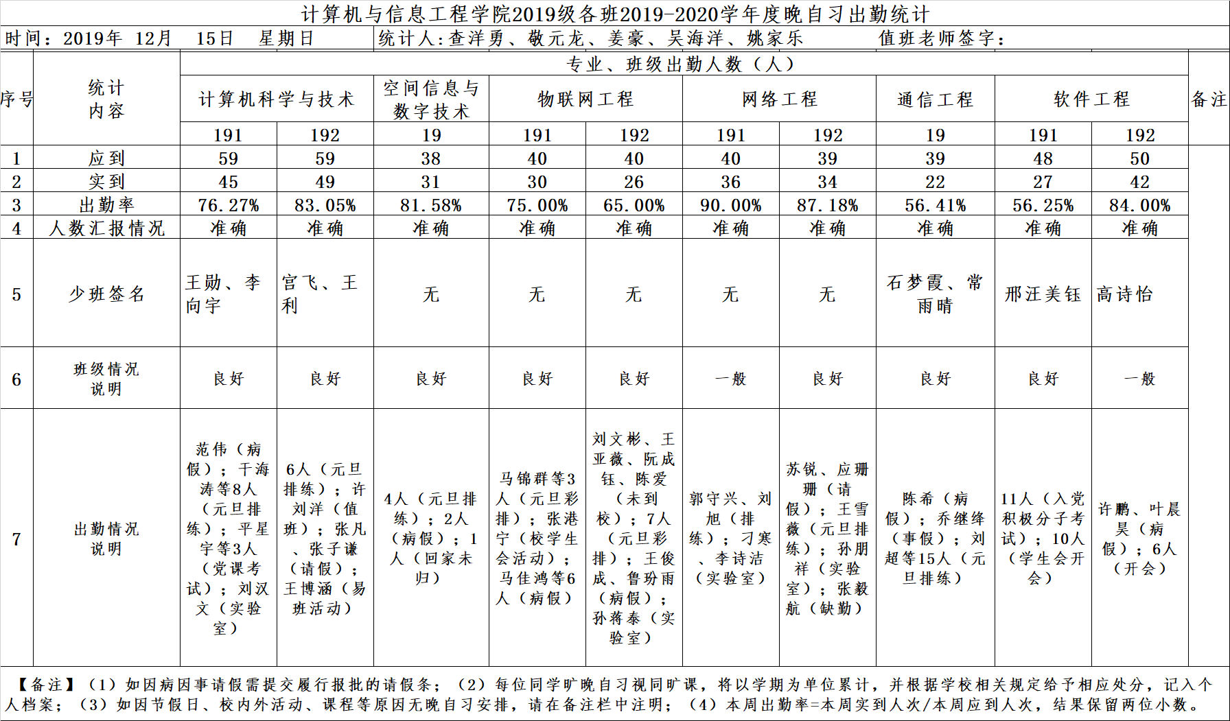 12月15日大一晚自习出勤情况