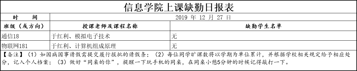 12月27日上课缺勤情况通报