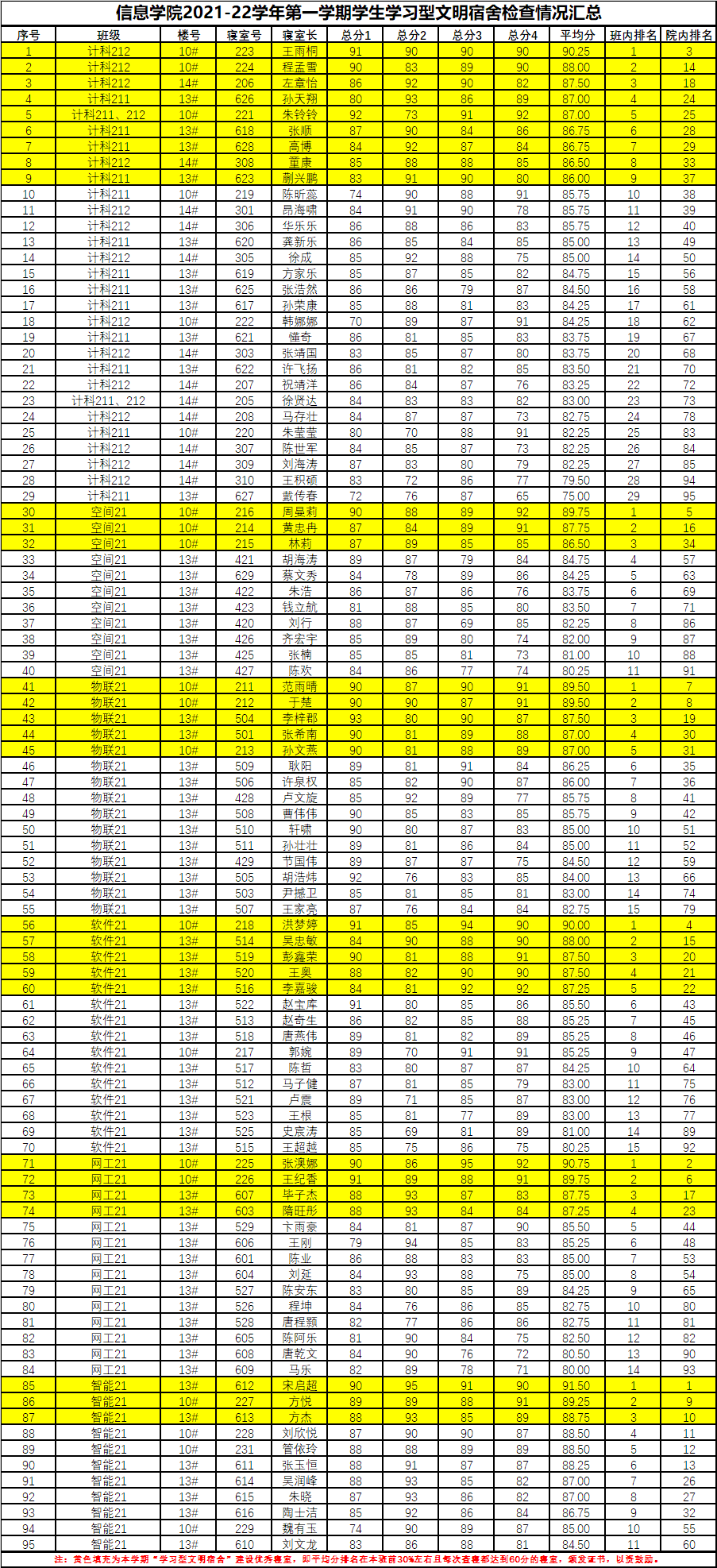 我院2021-22学年第一学期“学习型文明宿舍”检查情况汇总(21级)